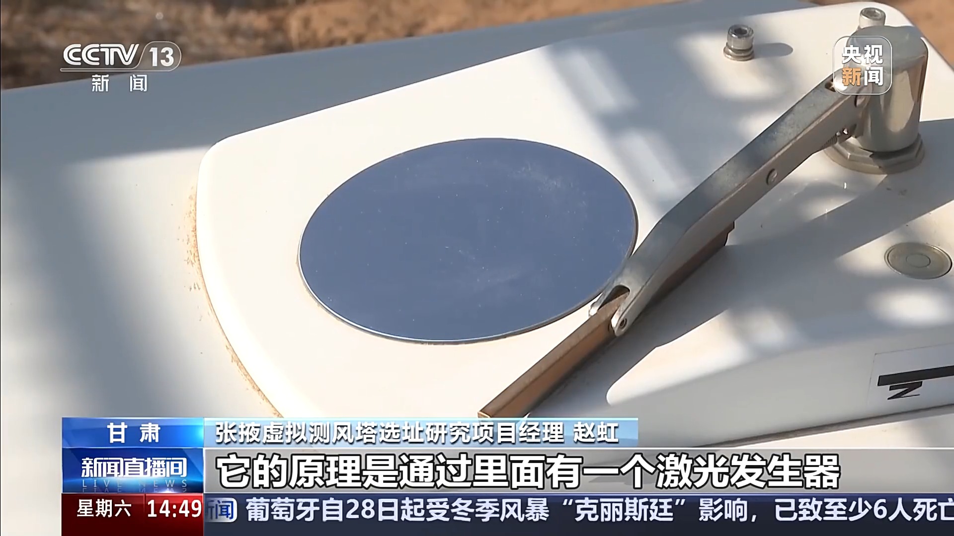张掖虚拟测风塔选址研究项目经理 赵虹:它的原理是通过里面有一个激光发生器,向上空发射激光,然后大气当中的气溶胶遇到激光以后,激光发生反射,再回到我们的测风设备上,通过这种激光反射频率的变化来测量出不同高度的风速和风向。